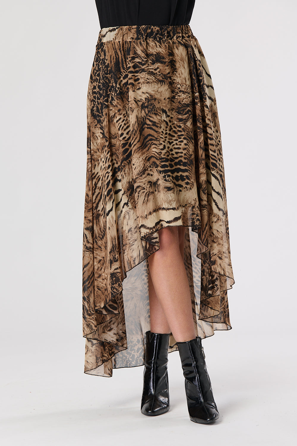 Animal printed chiffon skirt featuring elliptical hemline and fully elasticated waist.