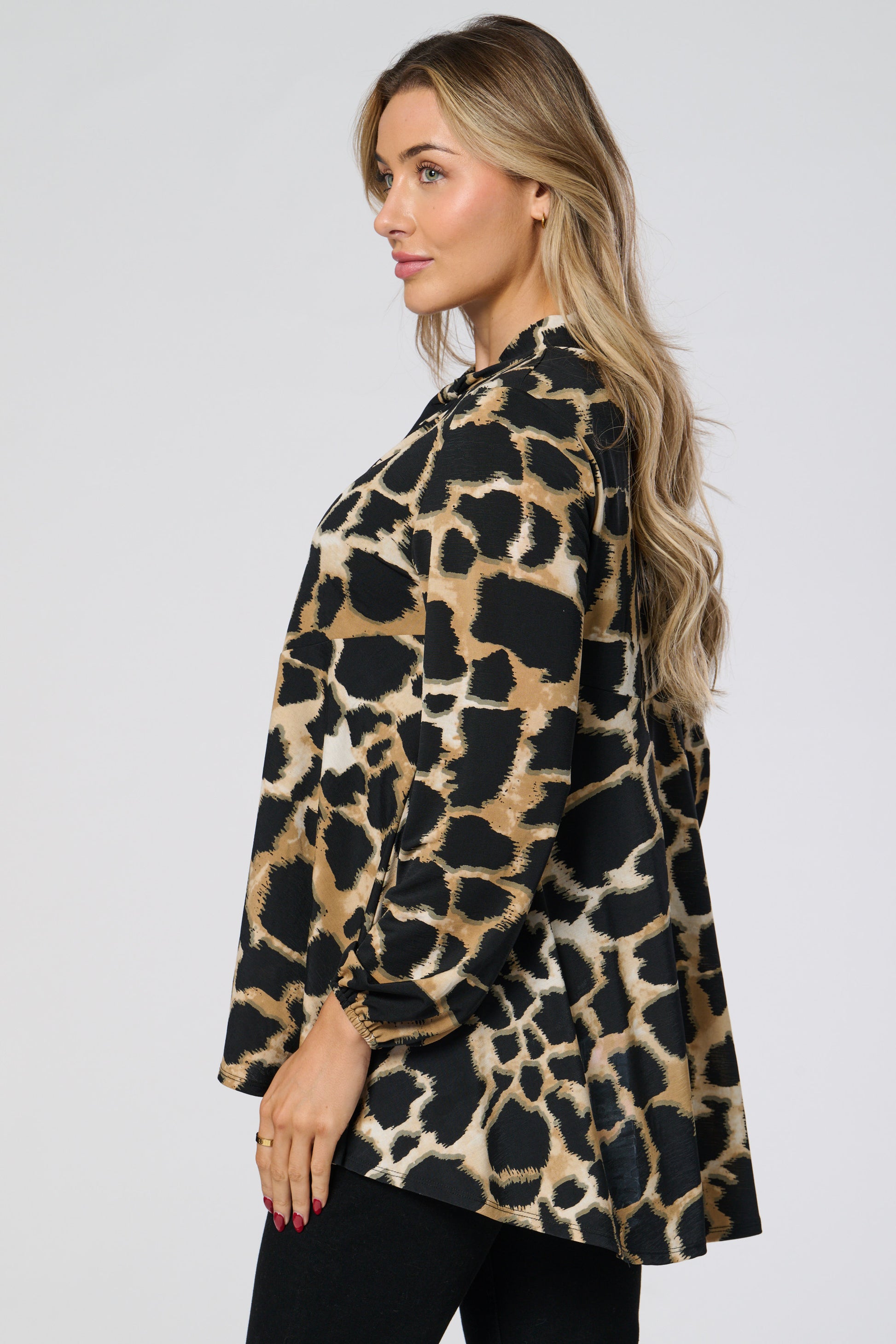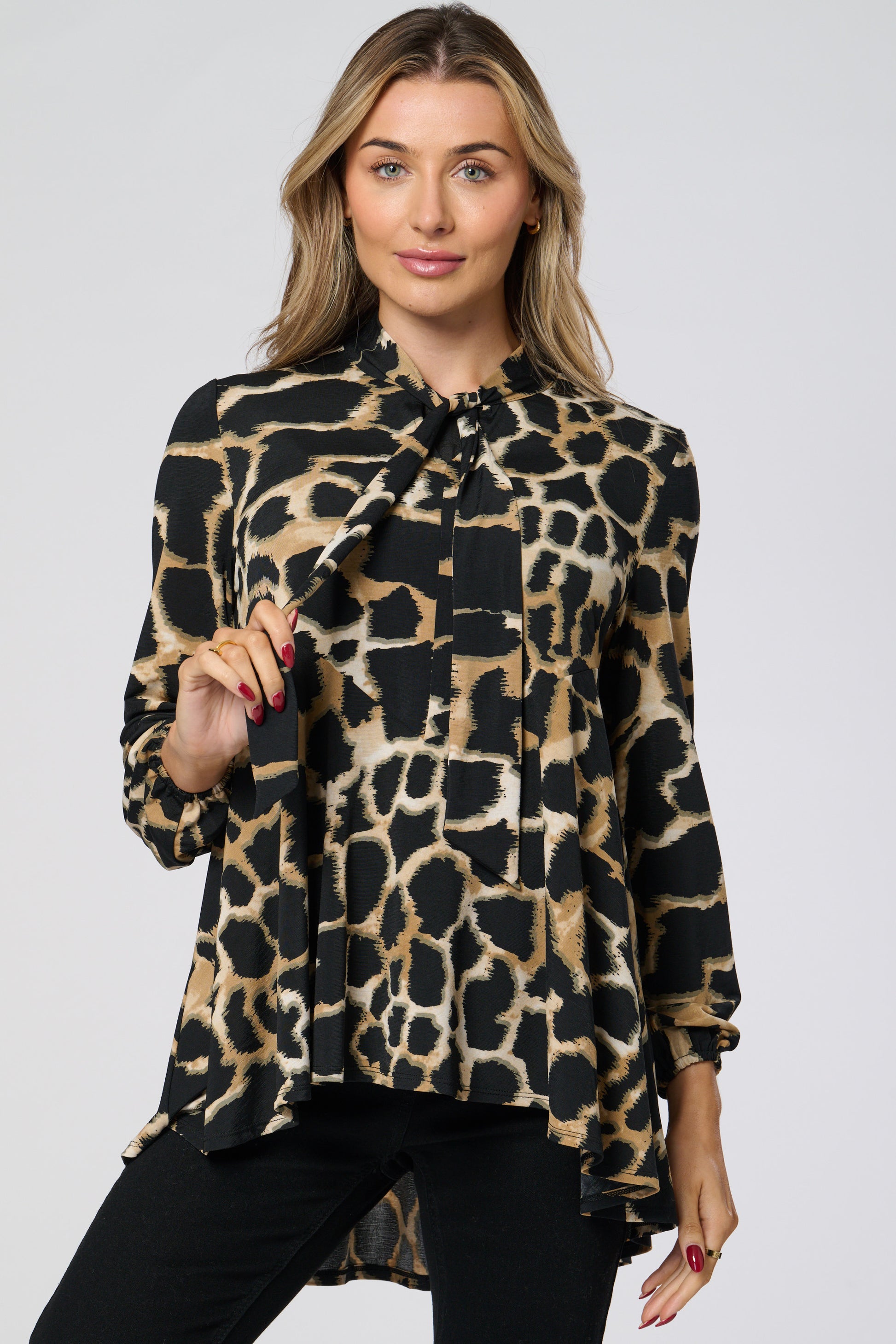 Animal printed blouse featuring neck collar tie and full length sleeves.