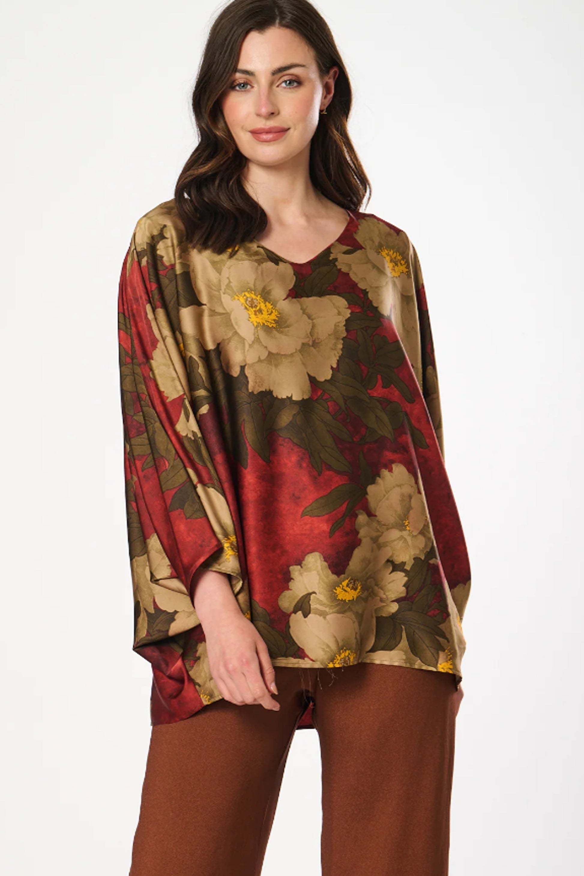 Satin style cape top featuring a vibrant delicate floral print, flattering batwing sleeves, and a sophisticated v-neckline,