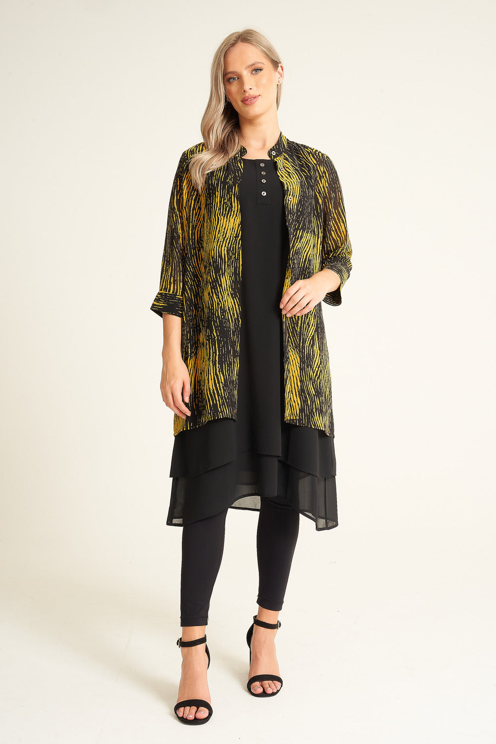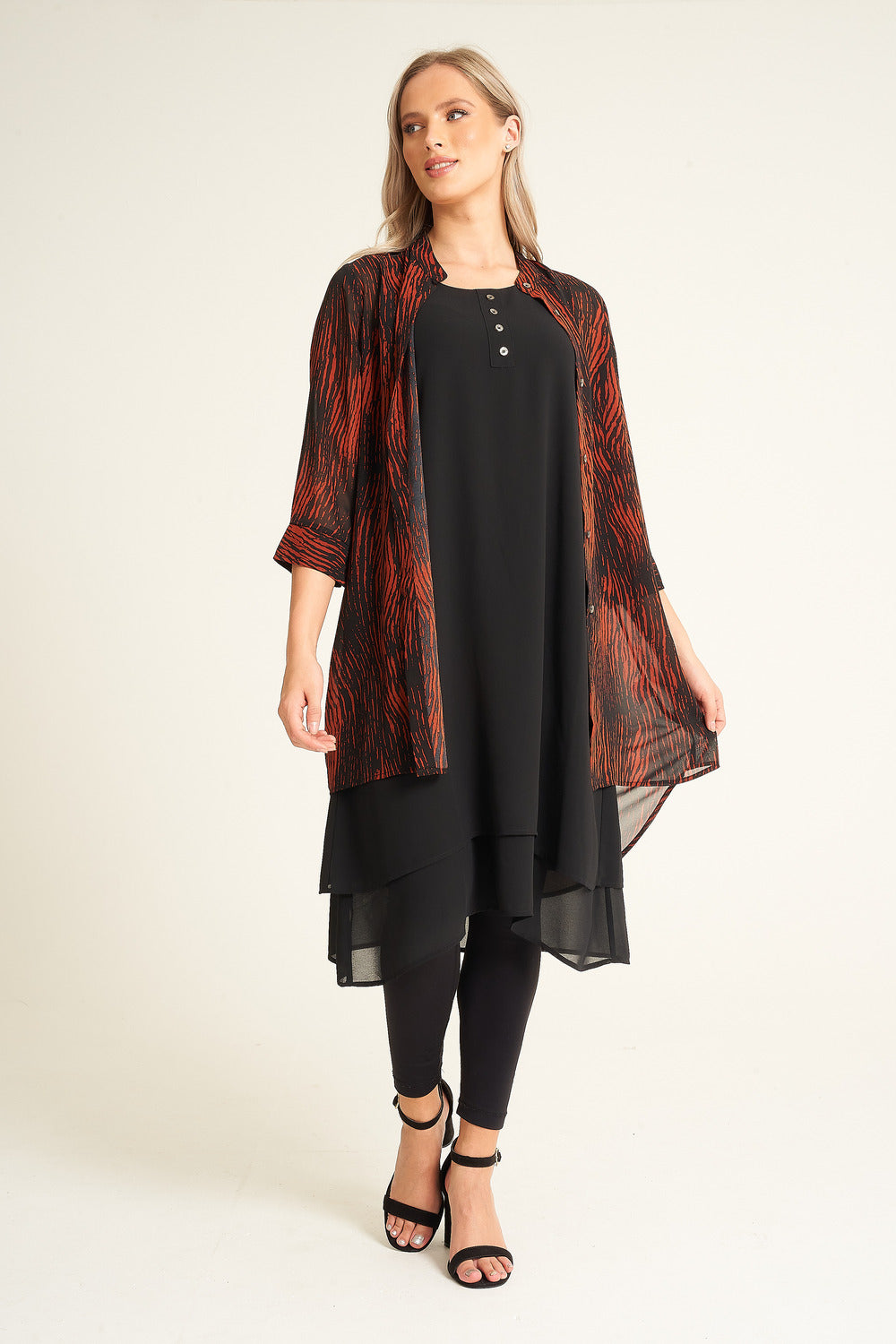 Abstract printed chiffon layered inset dress with contrast printed button-through jacket.
