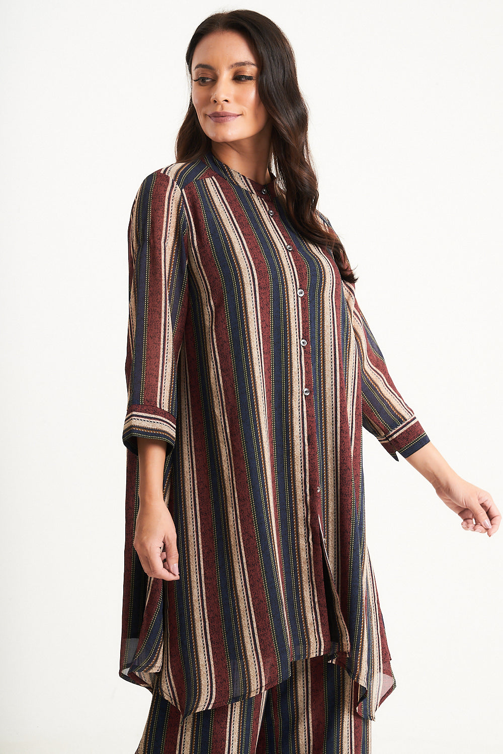 Chiffon stripe printed button through shirt dress featuring three quarter length sleeves with cuffs.