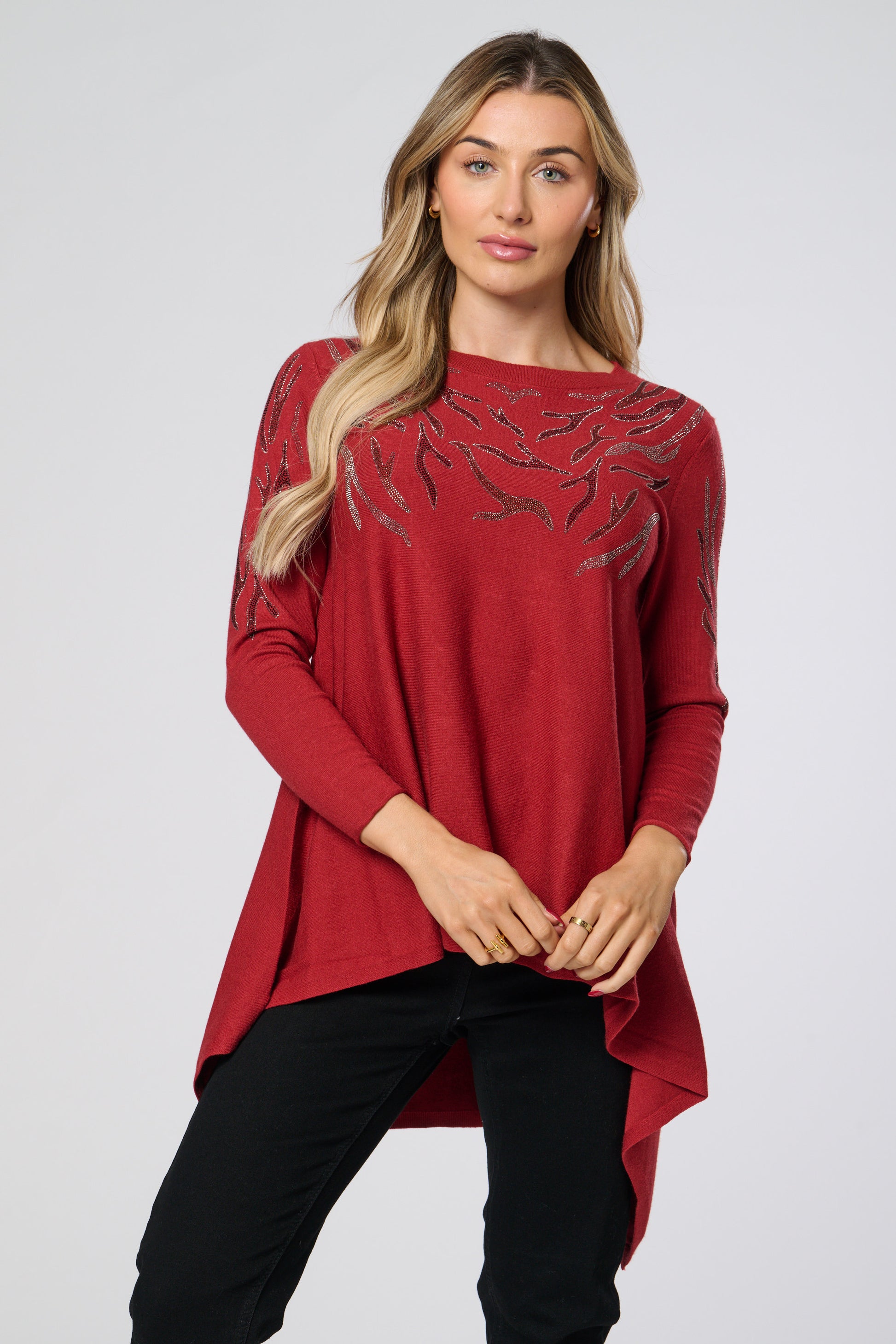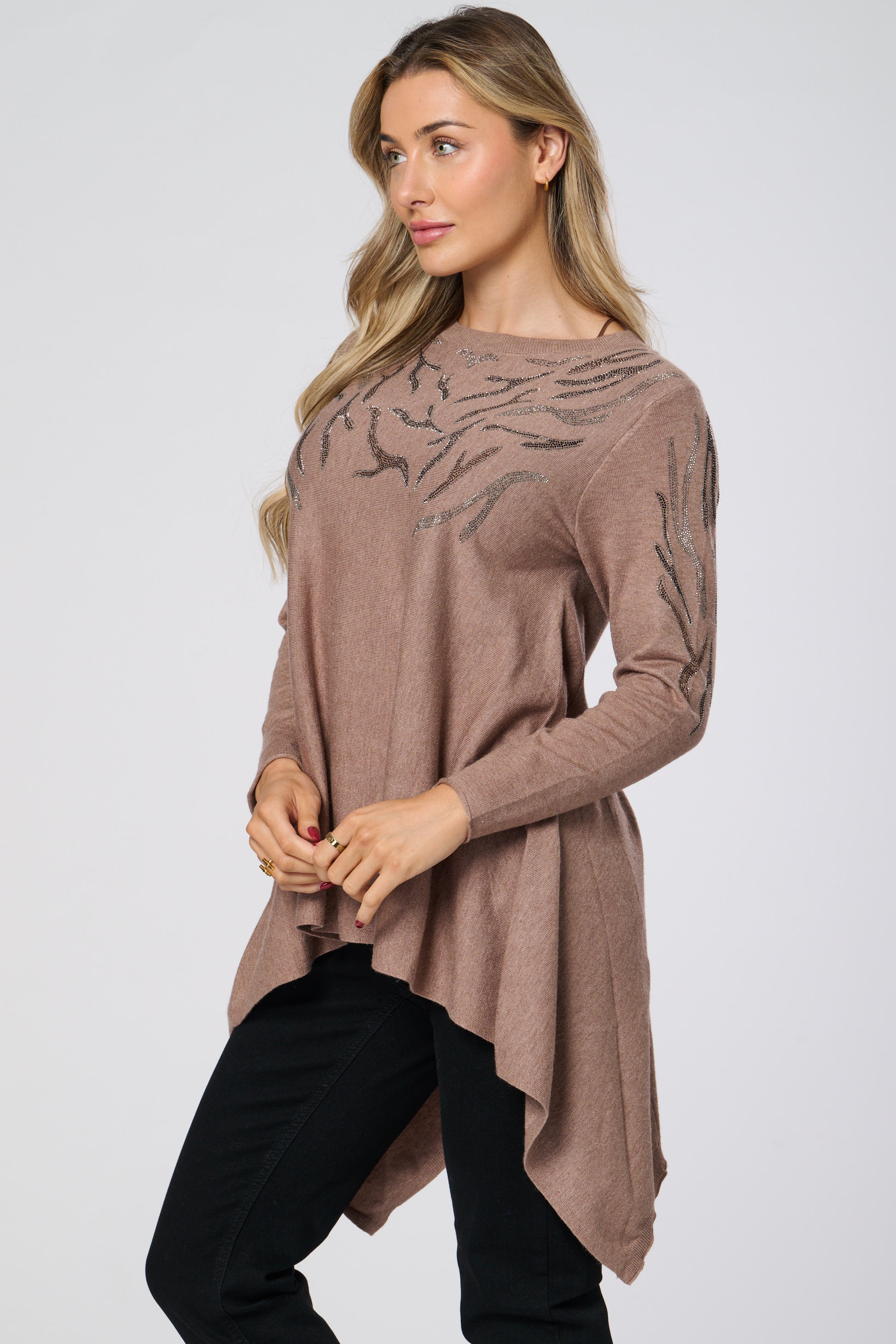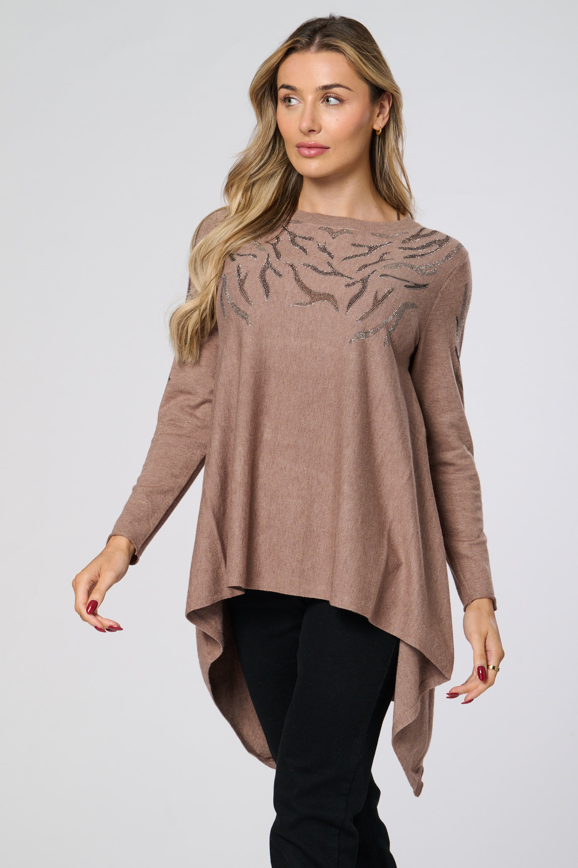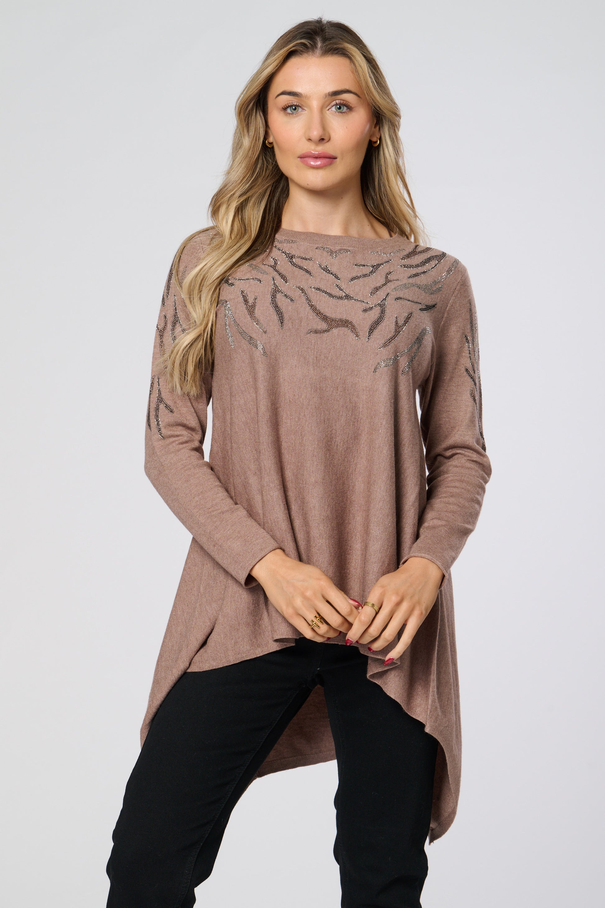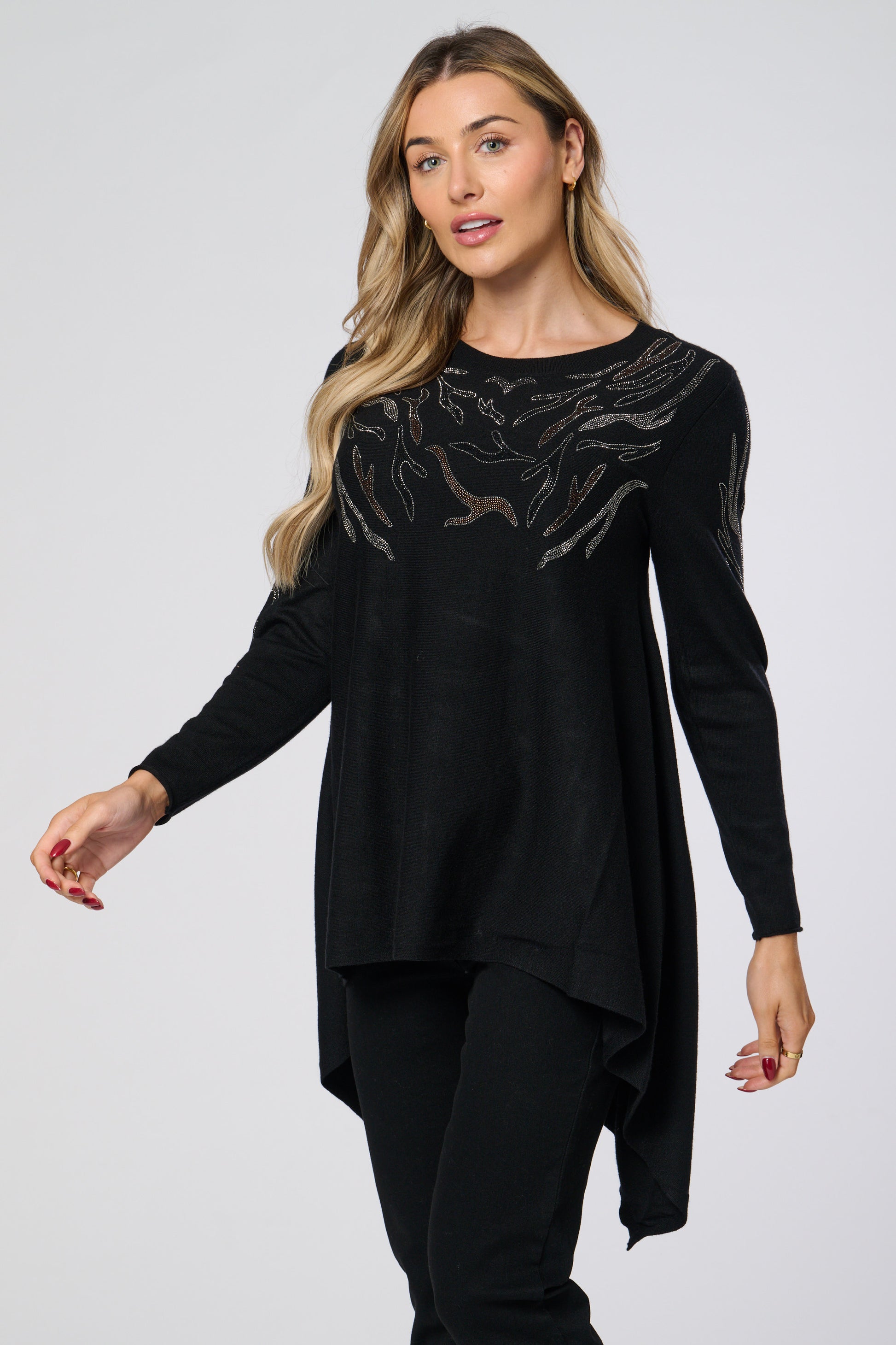 Embellished pointed hem knitted tunic top with full-length sleeves and round neckline.