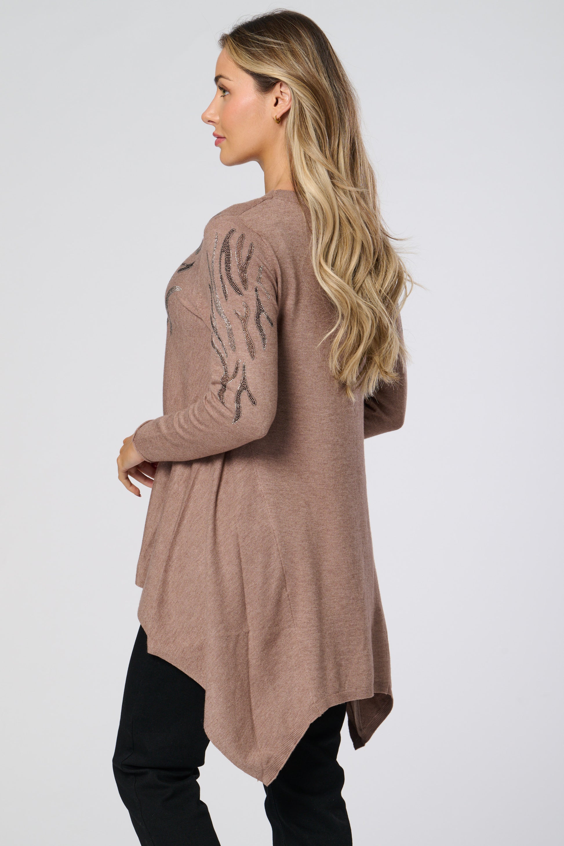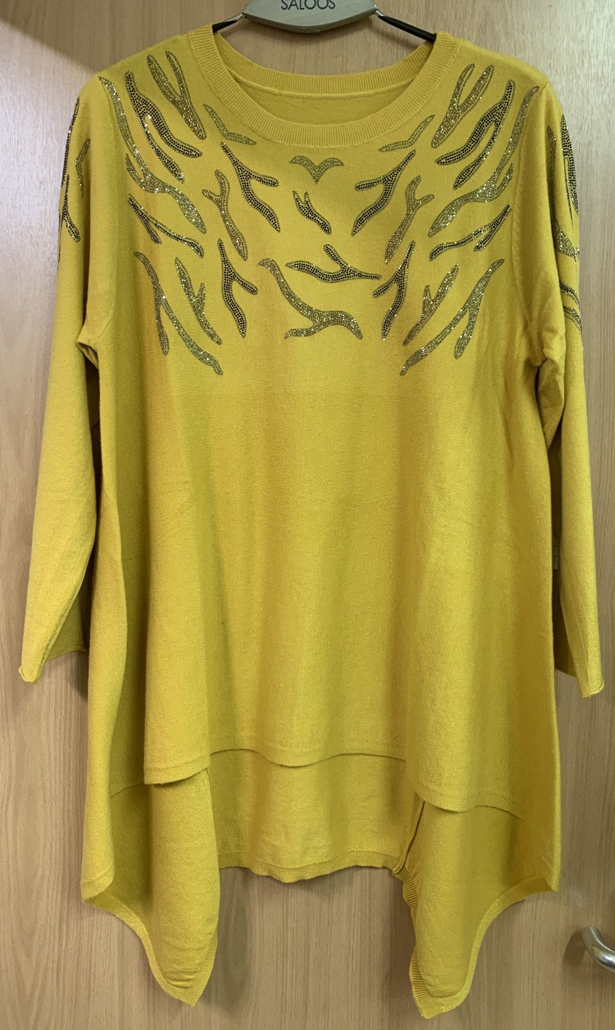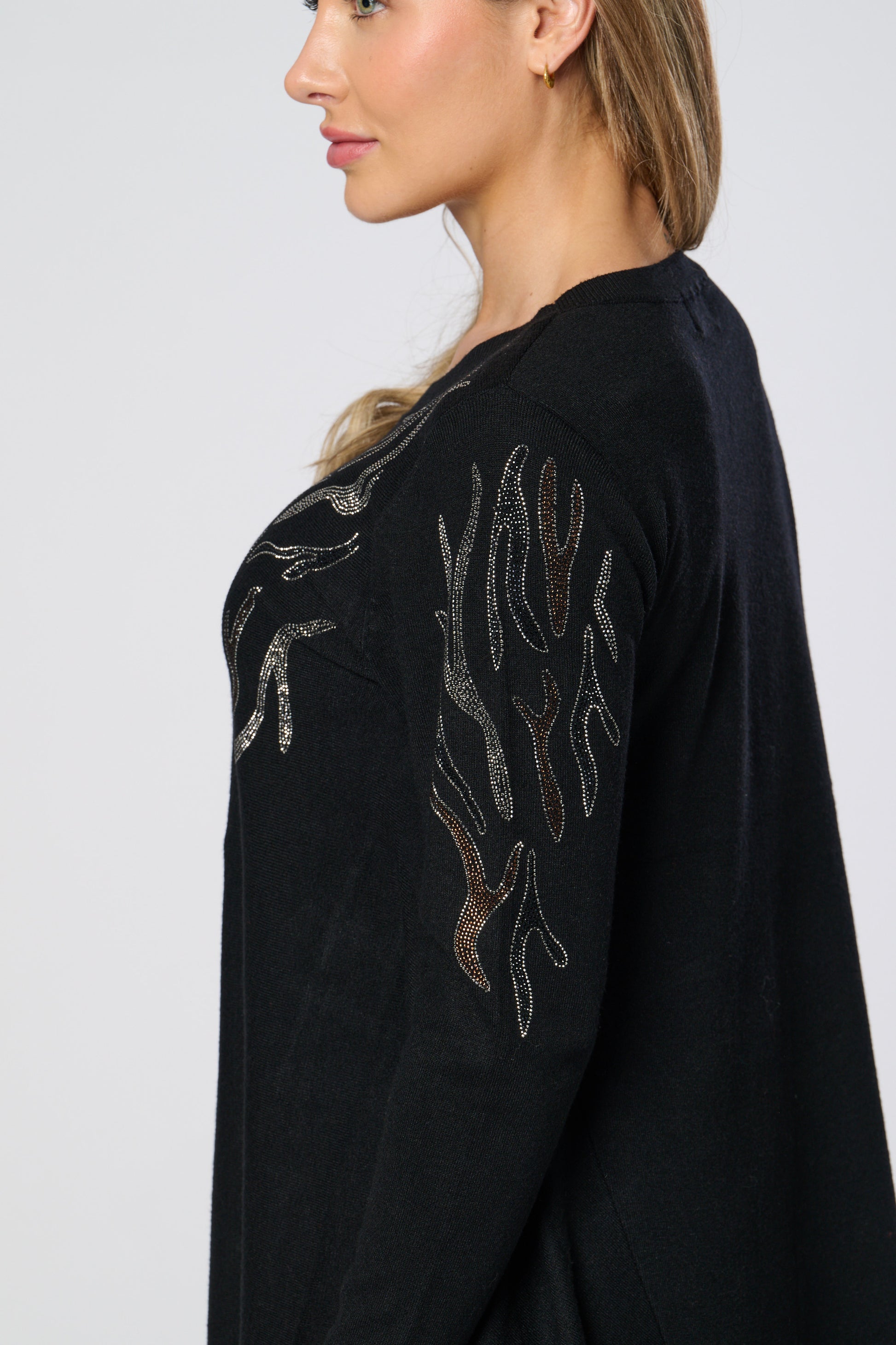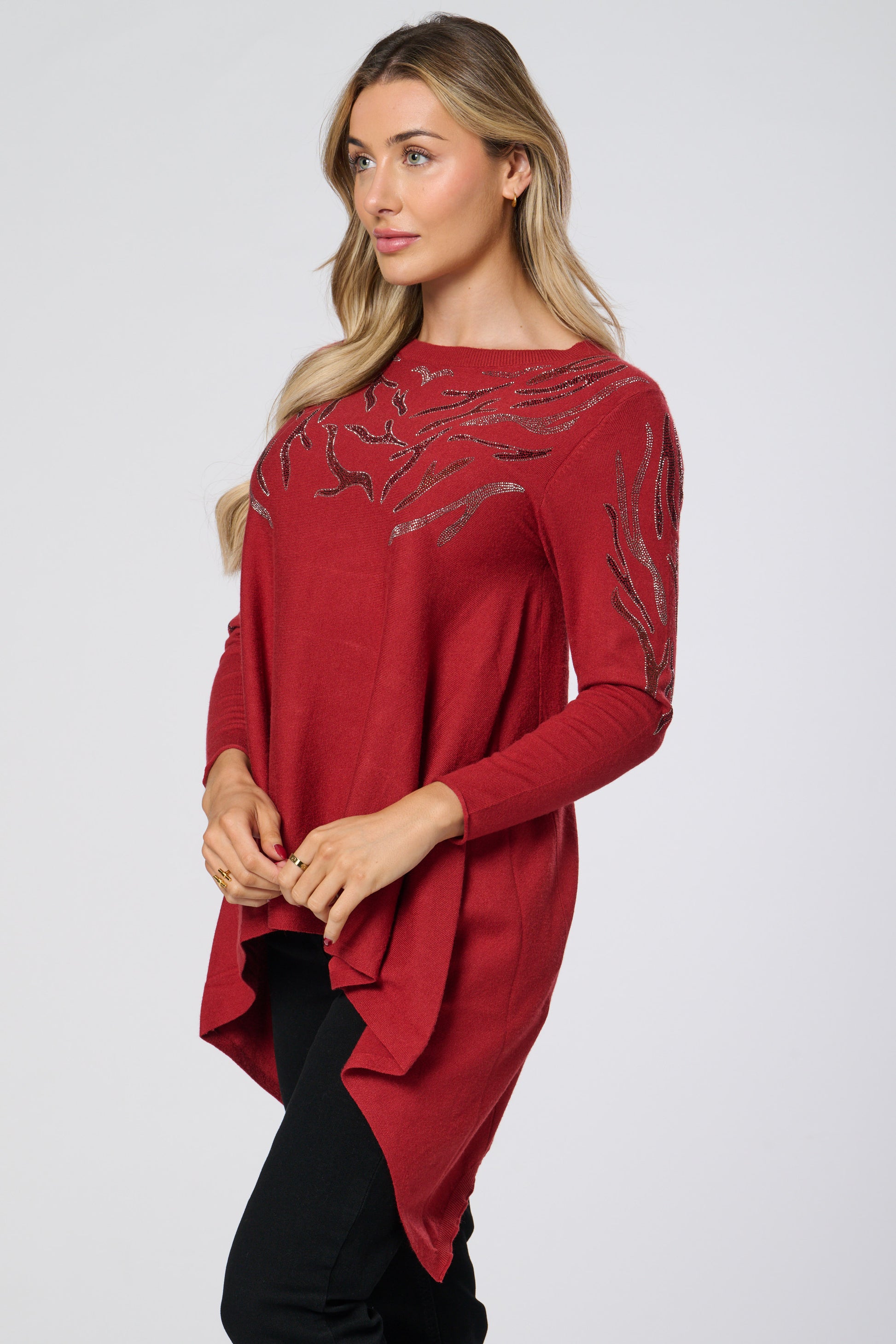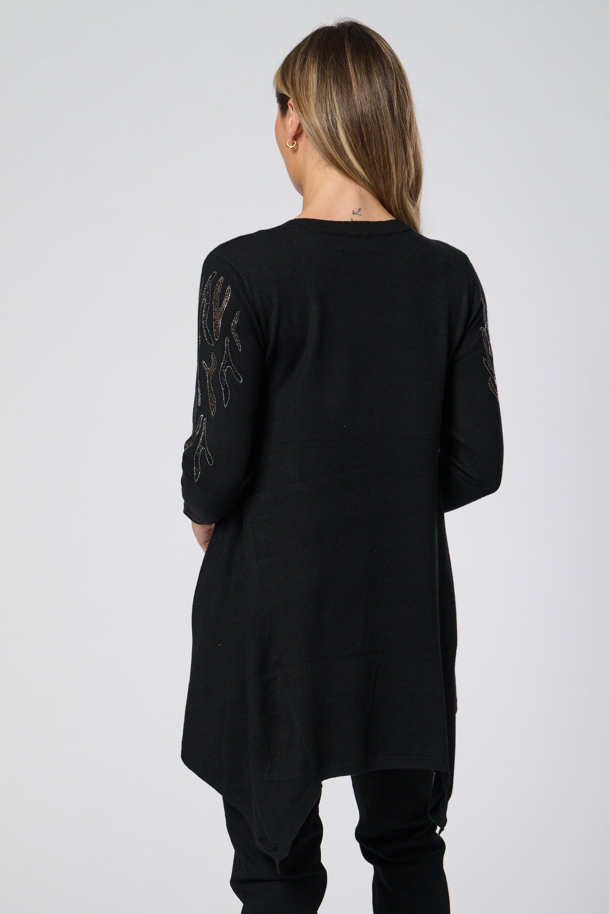 Embellished pointed hem knitted tunic top with full-length sleeves and round neckline.