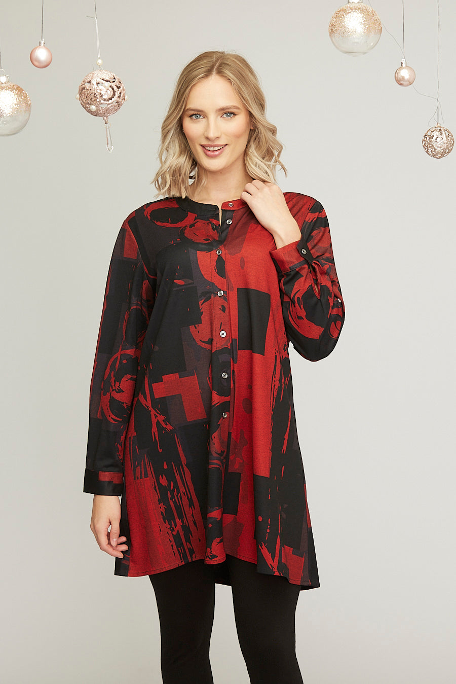 Abstract print button through shirt tunic featuring mandarin collar detail.