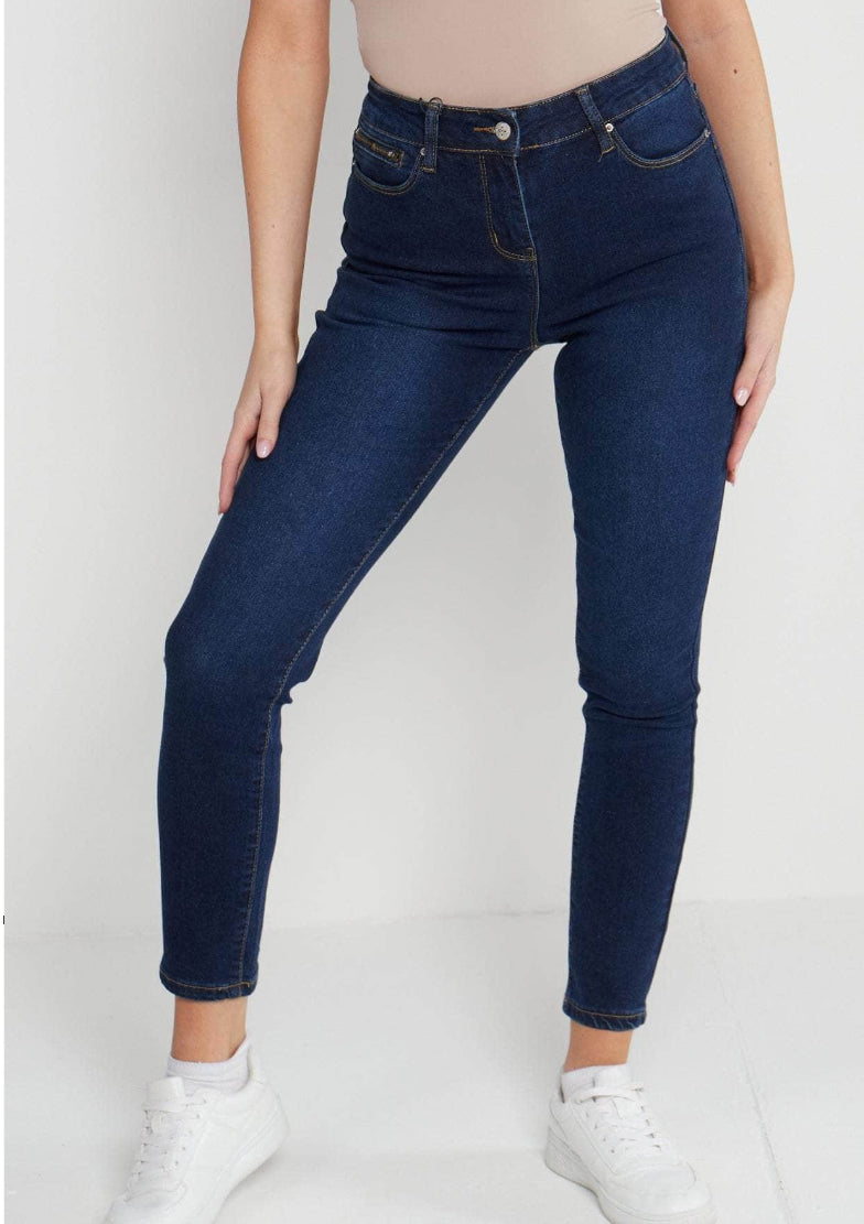 Mid-denim wash comfort cotton blend jeans - tapered leg style featuring pockets and front zip and button fastening.