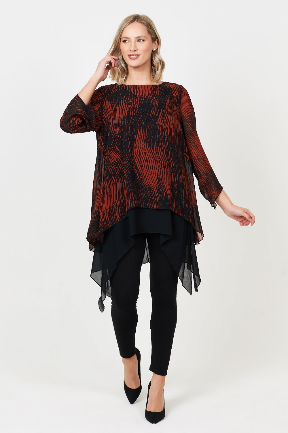 Abstract printed chiffon double layered tunic top featuring full length flared sleeves.