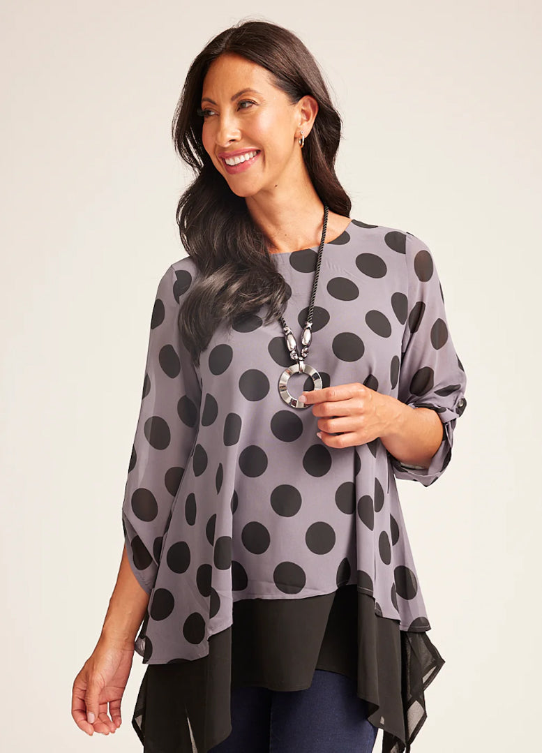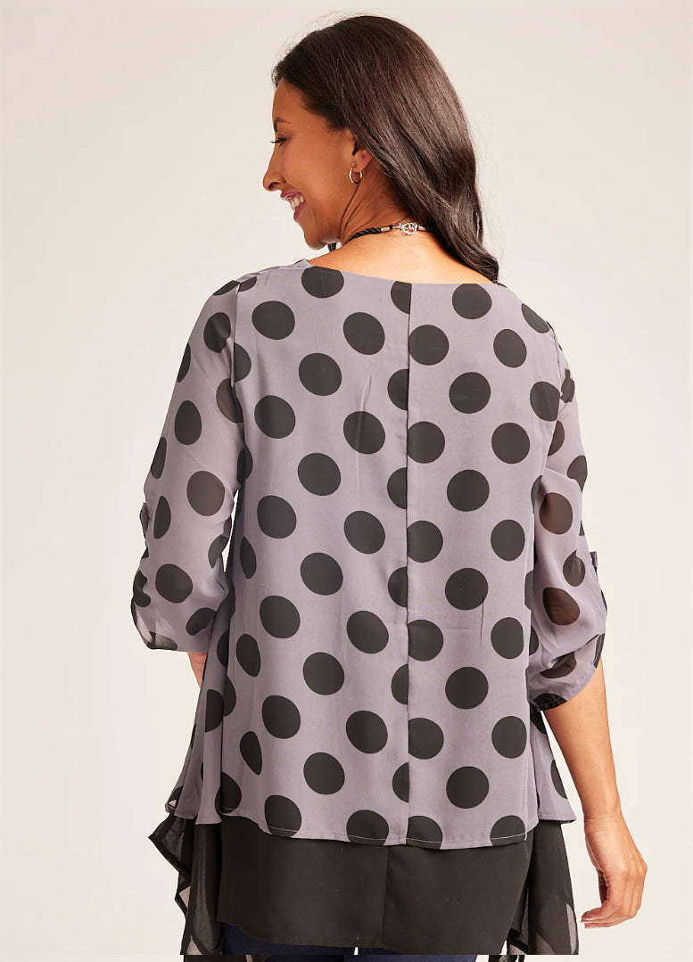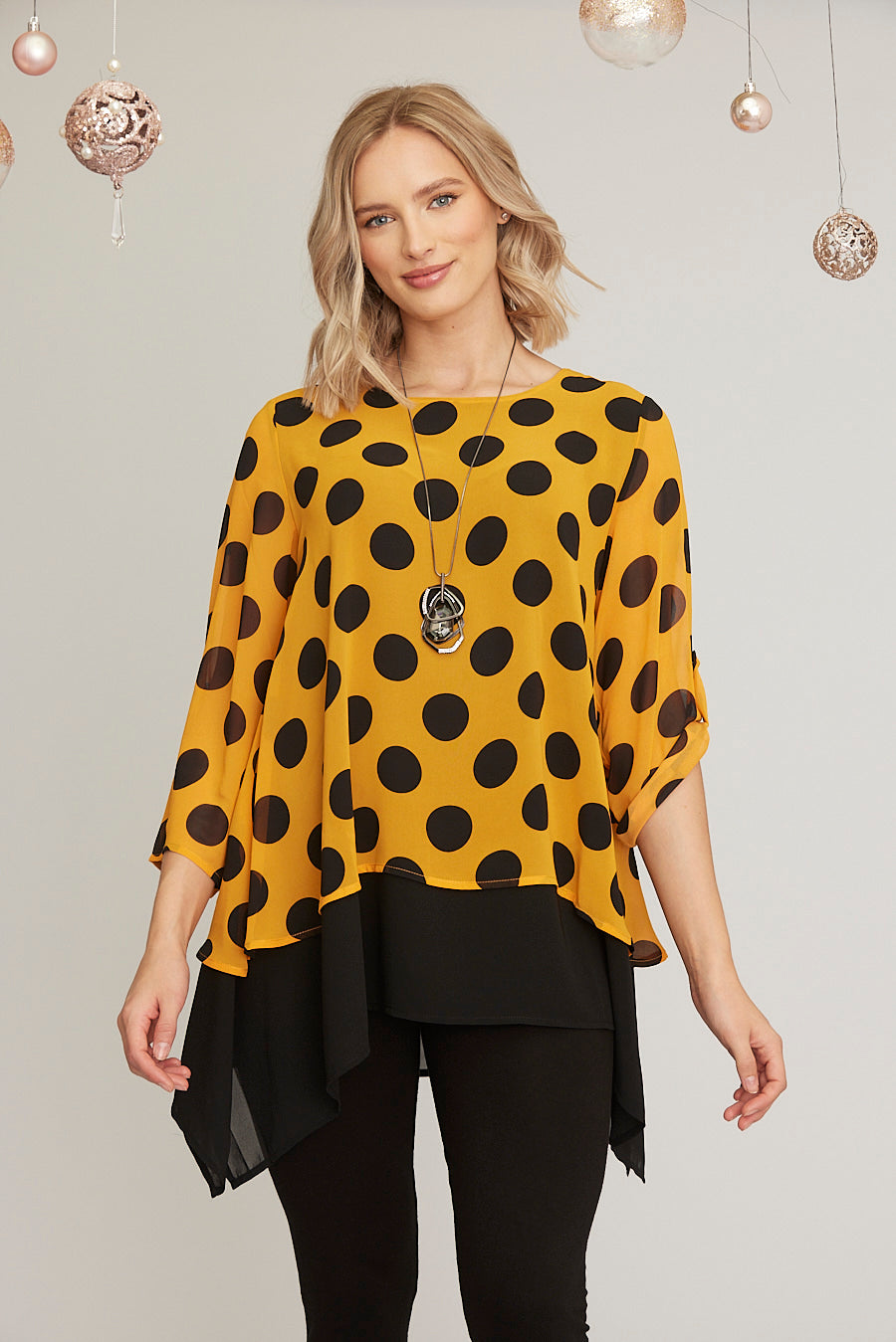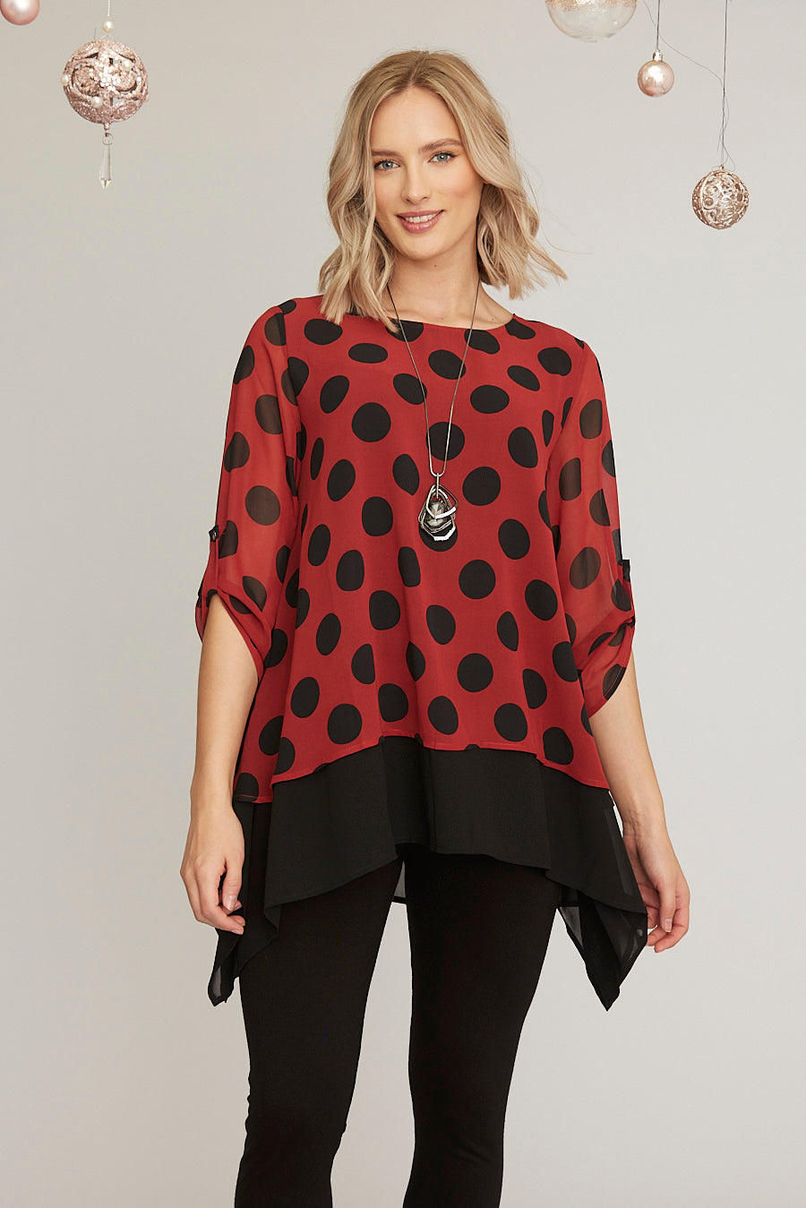Polka dot printed double layered chiffon tunic top featuring colour block underlay and button-tab roll-up sleeves.