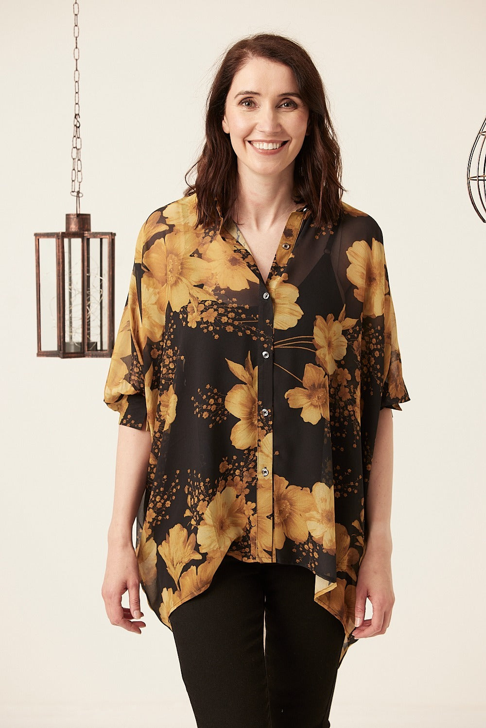 Oversized poncho shape button through blouse made from sheer, lightweight fabric in a vibrant floral print. Gathered cuff details, front button closure and a hi-low hemline.