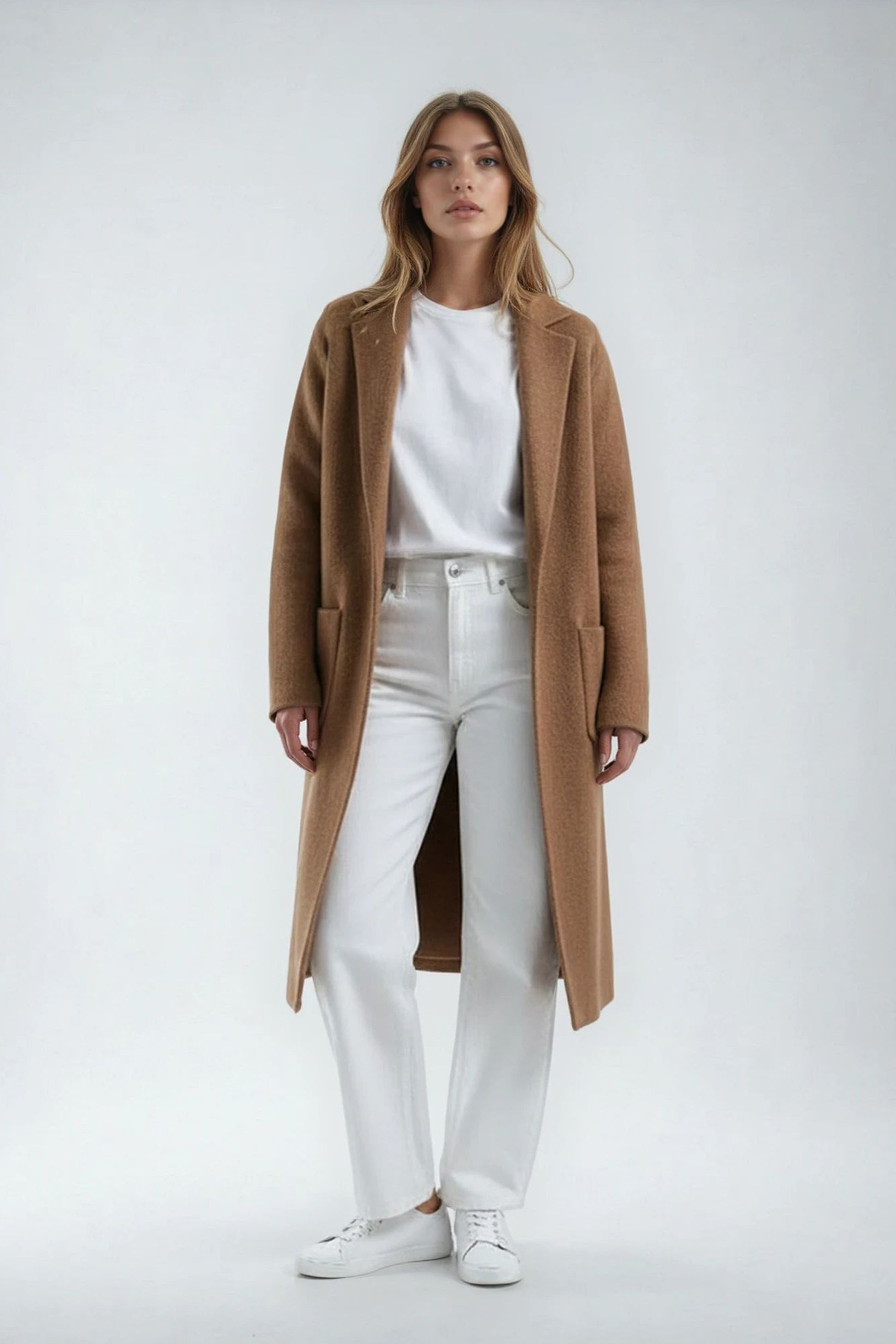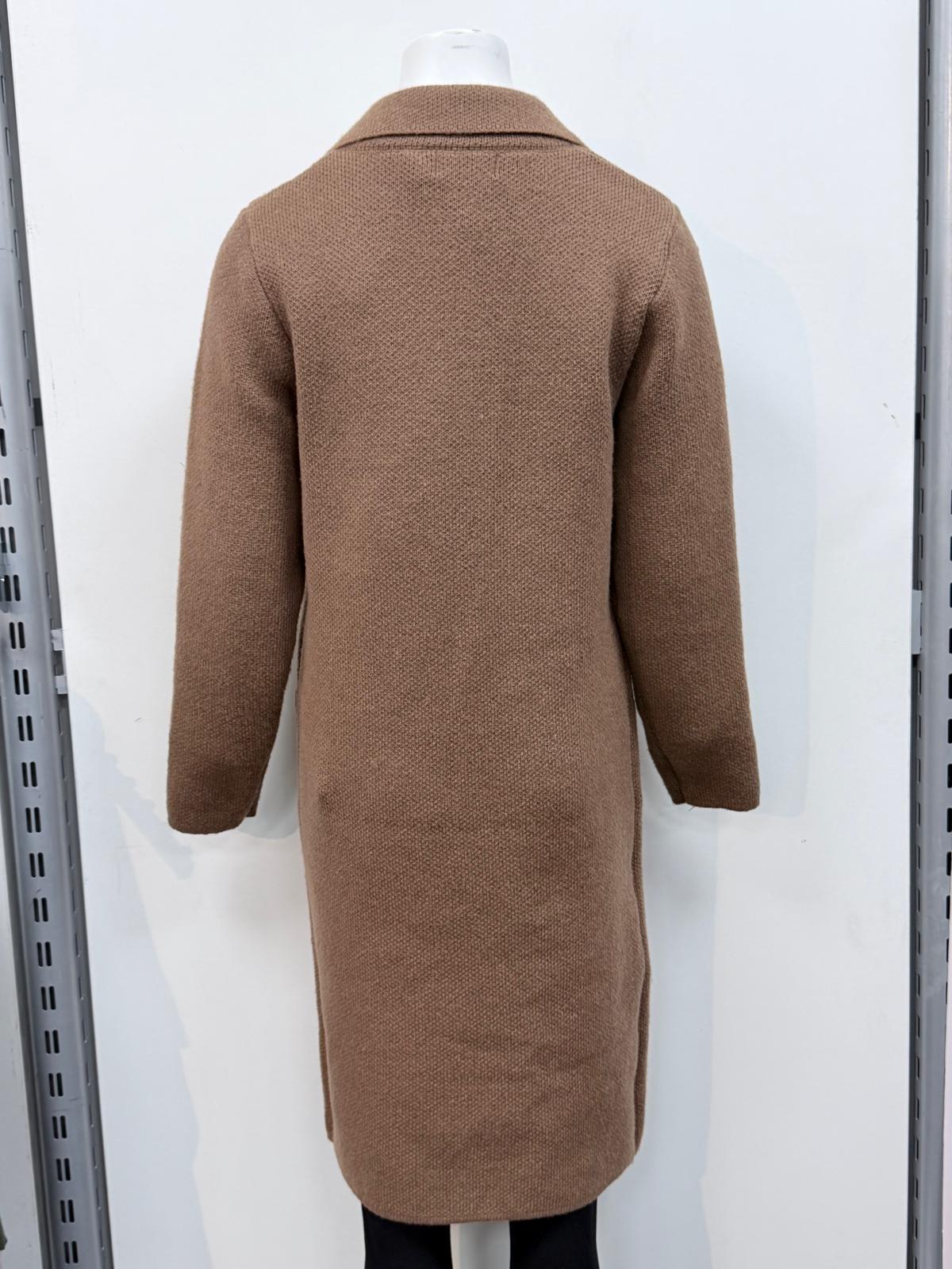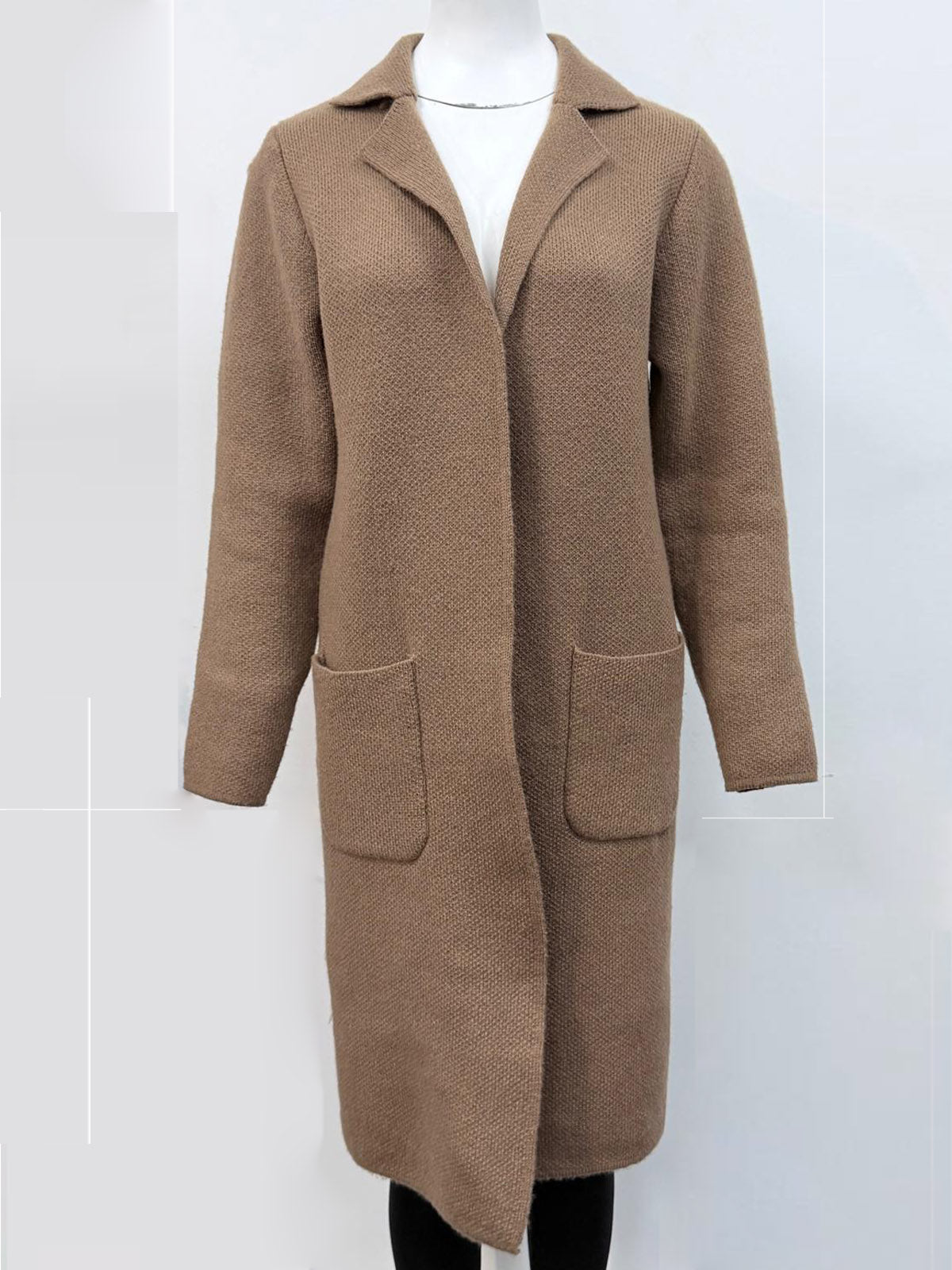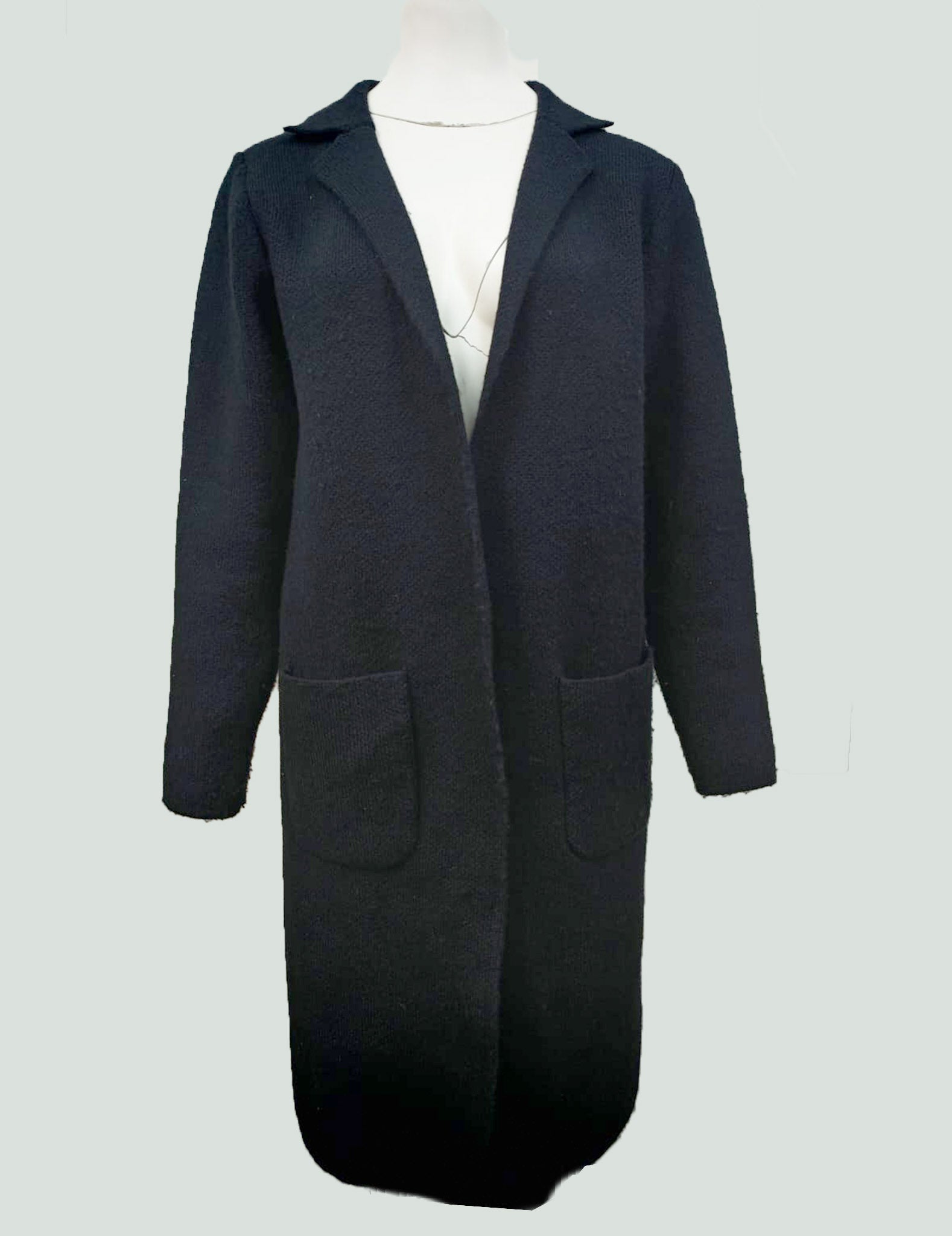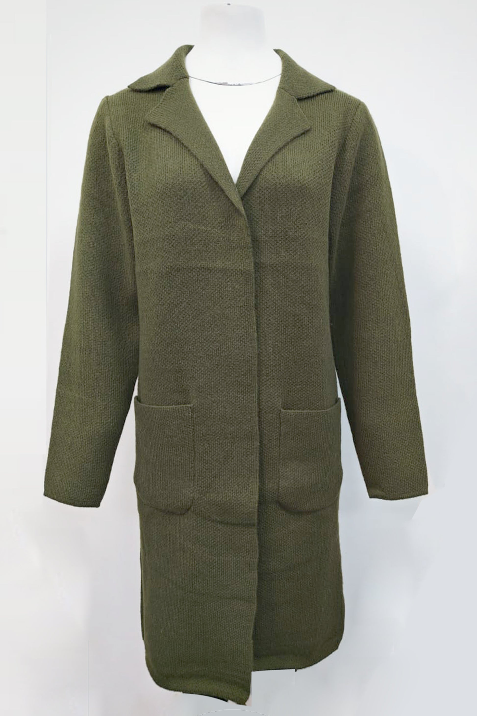 Full-sleeved knitted long-length jacket with pockets.