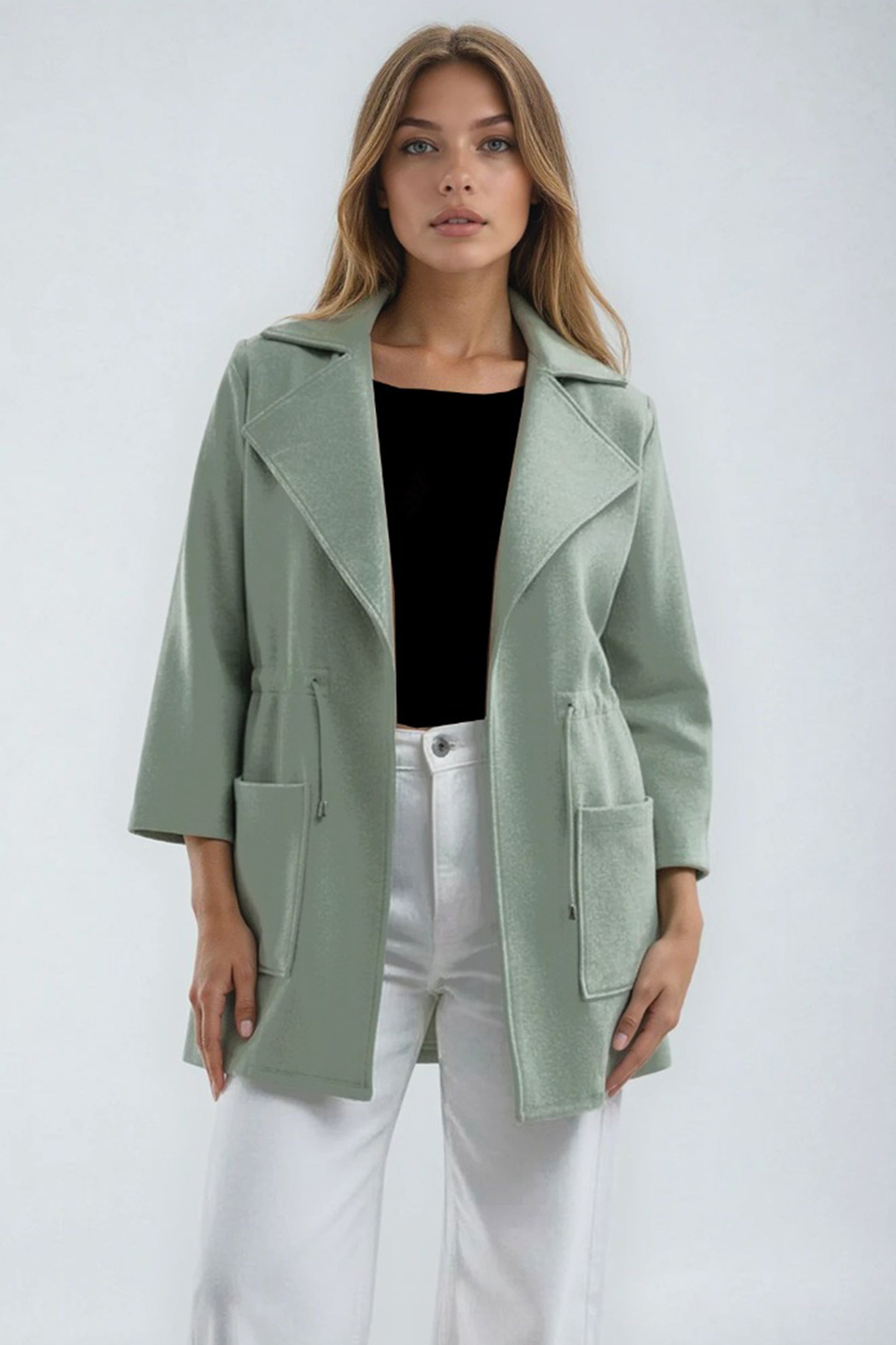 Drawcord waist large casual everyday jacket featuring large pockets and full length sleeves. Button tab detail.