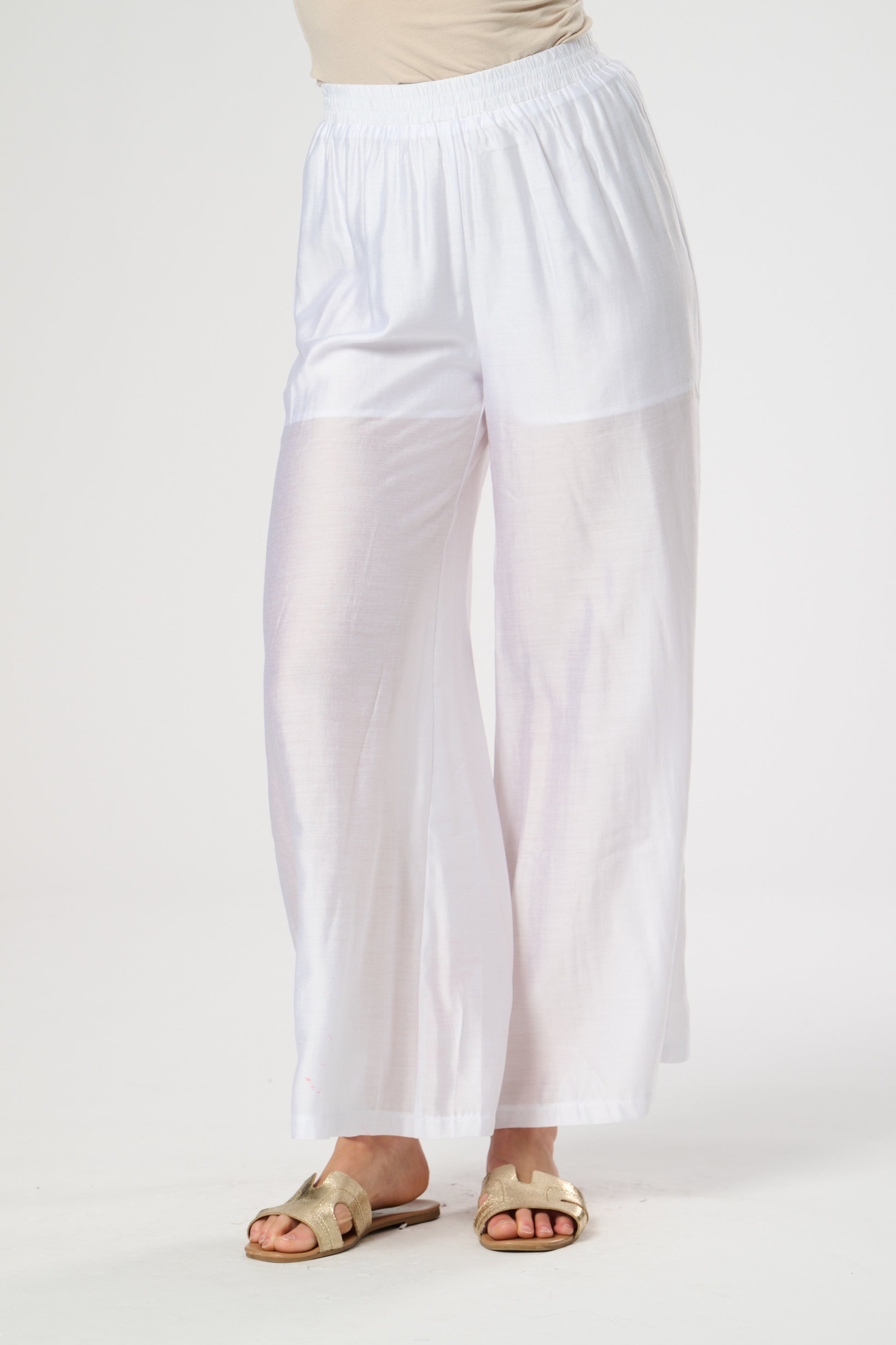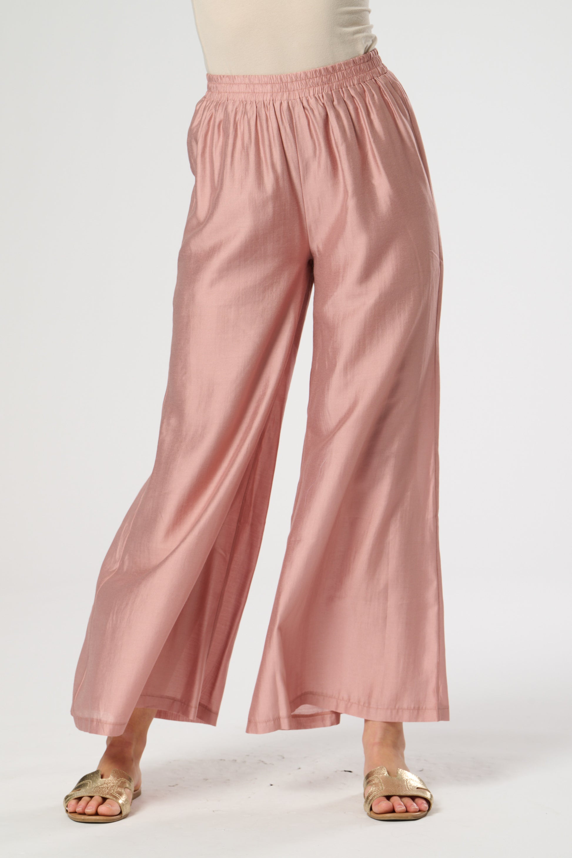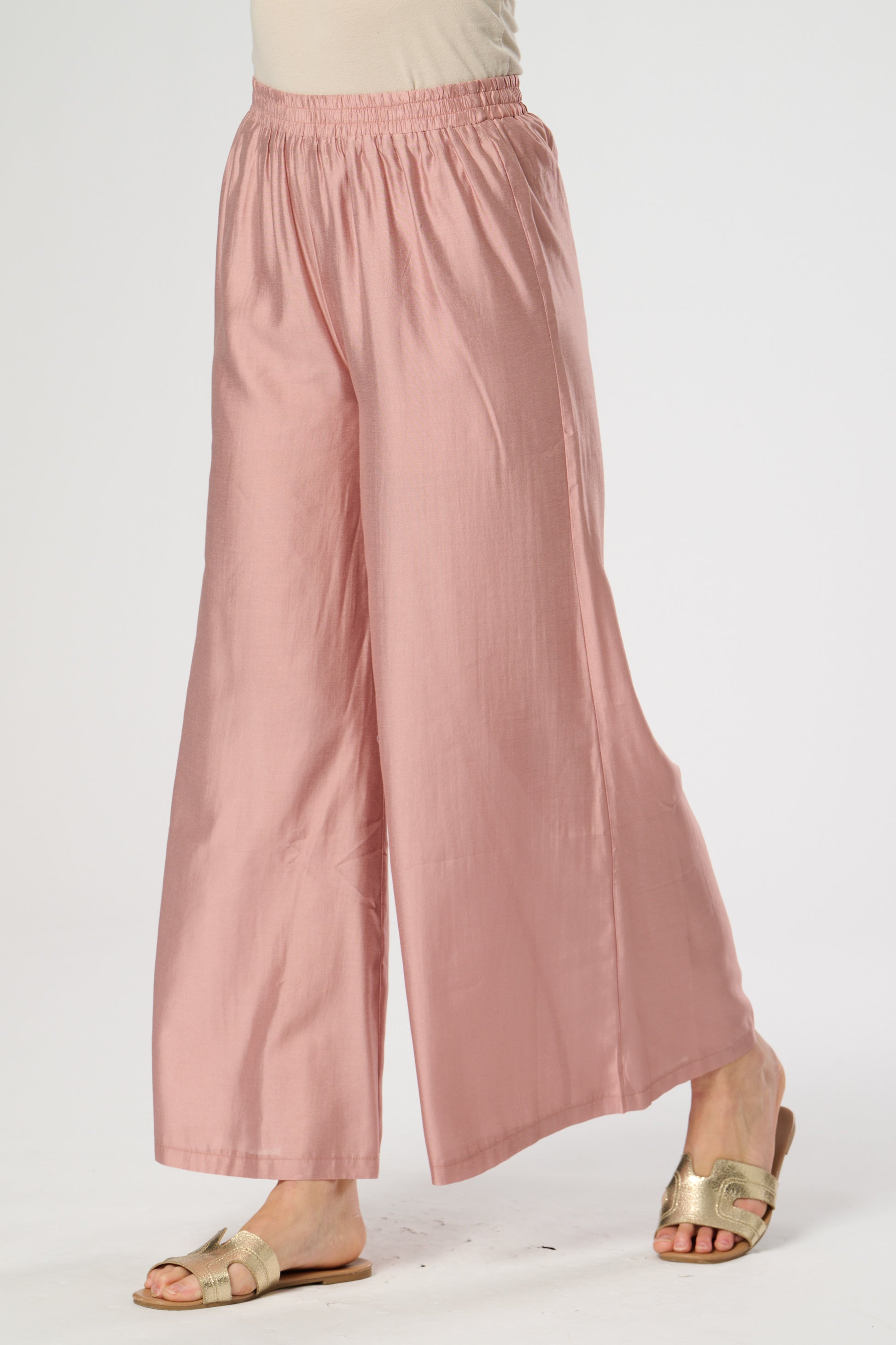 Wide leg summer trouser in silk touch fabric featuring elasticated waist. Fully Lined.