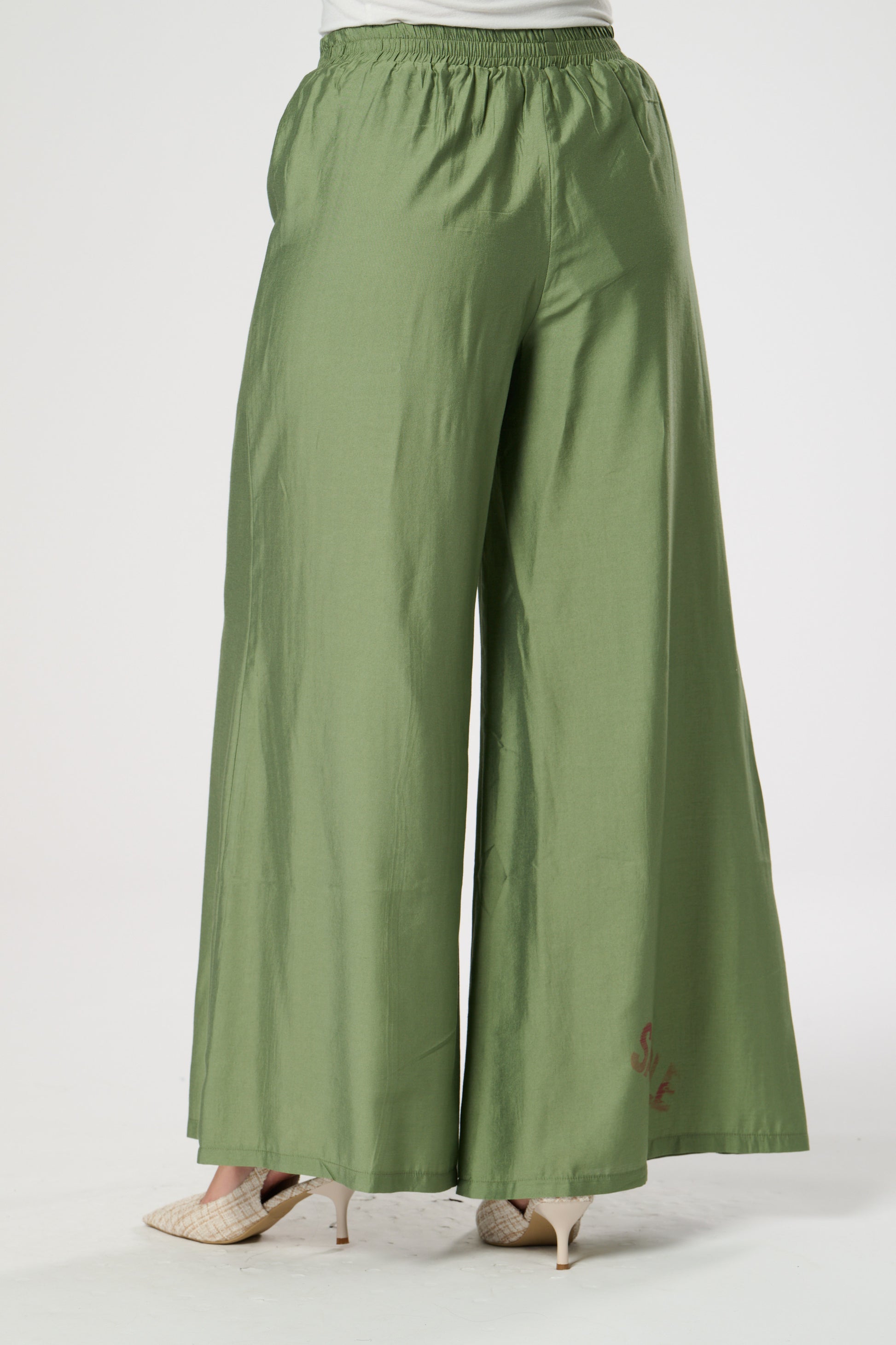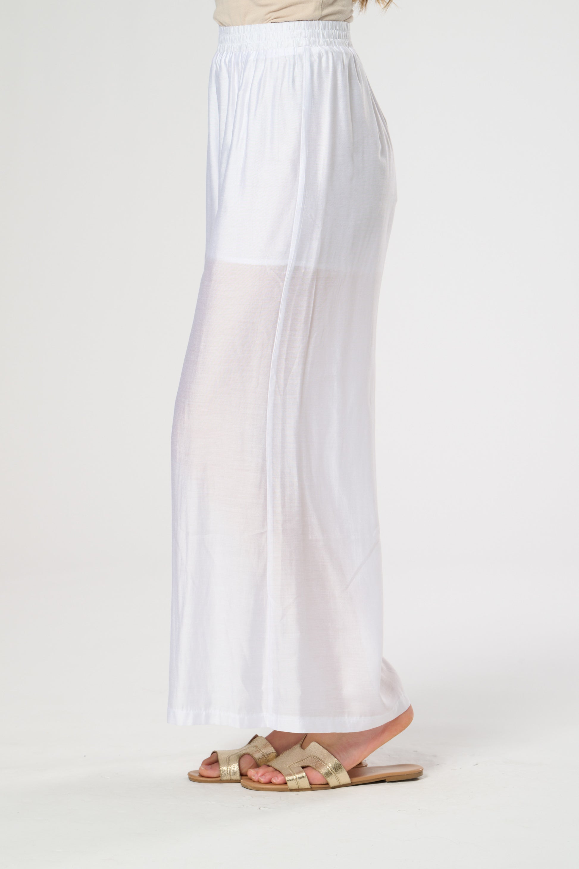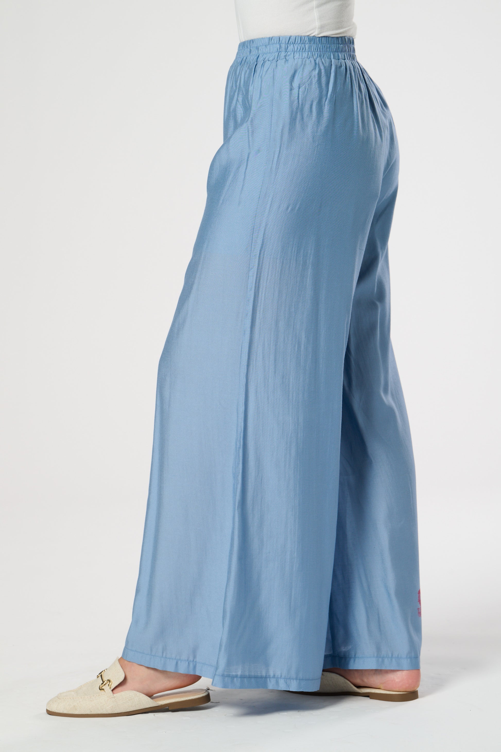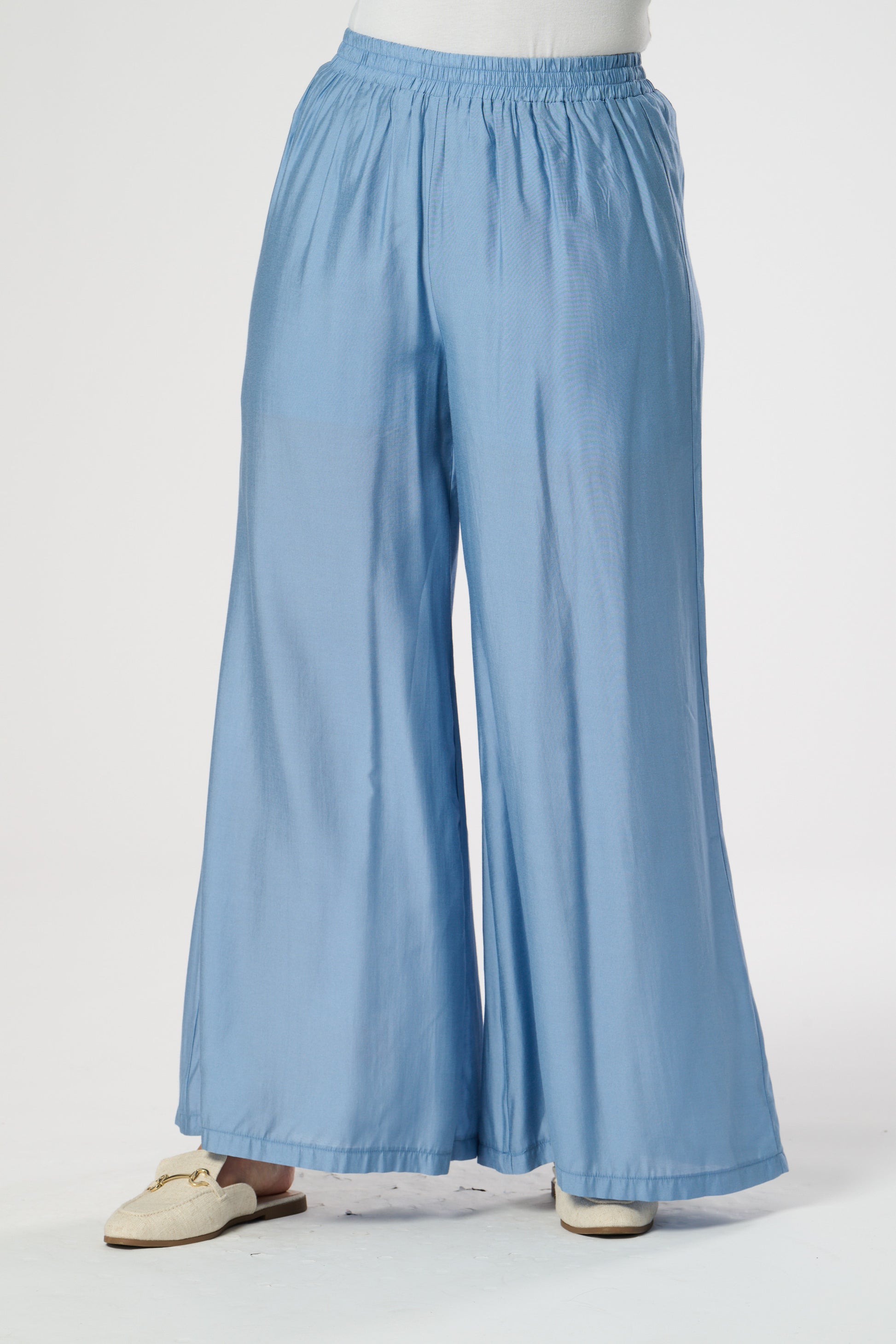 Wide leg summer trouser in silk touch fabric featuring elasticated waist. Fully Lined.